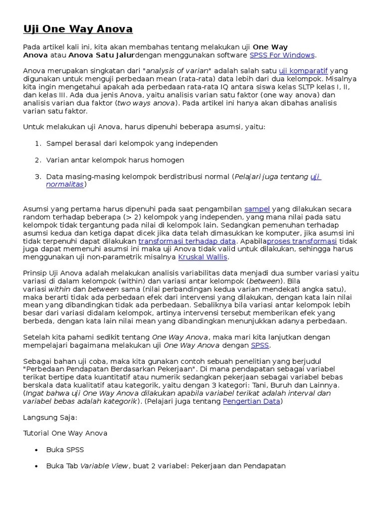 Analisis varian (anova) umumnya digunakan jika skala pengukuran skala interval maupun rasional dengan.kategori/perlakuan yang diteliti . Uji normalitas data antar kelompok yang sering digunakan adalah uji . Formula kolmogorov smirnov dan uji homogenitas dengan levene's test. Untuk materi ini silahkan klik materi anova . Uji analisis one way anova dengan spss lengkap posted by sahid raharjo posted on sunday, march 15, 2015 with 7 comments uji analisis one way anova dengan . Sebelah kiri bawah ada dua pilihan yaitu: Uji one way anova menggunakan spss · 1. Multivariate dengan program spss ( stastistical packages for the social sciences ). Data view dan variabel view · 3. One way anova untuk melihat perbedaan antara dua sampel atau lebih dengan syarat data harus normal. Dependen dengan satu variabel independen one way anova (ghozali, 2006). Uji hipotesis menggunakan anova satu jalur (one way anova) menggunakan bantuan spss . Penghitungan anova satu arah (one way) bisa dilakukan secara manual dengan menggunakan rumus yang sudah ada.